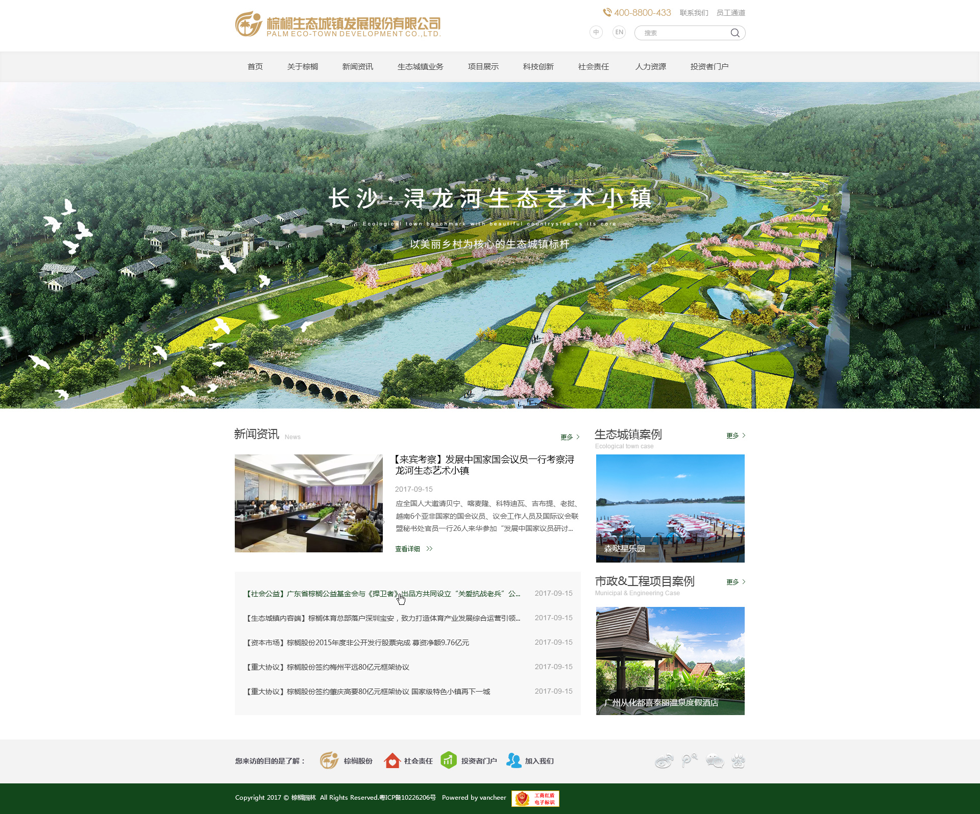 棕櫚股份(全稱:棕櫚生態(tài)城鎮(zhèn)發(fā)展股份有限公司)始創(chuàng)于1984年,是國內(nèi)少有的,緊隨新型城鎮(zhèn)化政策發(fā)展方向,并以生態(tài)城鎮(zhèn)業(yè)務(wù)為戰(zhàn)略發(fā)展核心的上市公司。 公司前身為“棕櫚園林股份有限公司”,2010年6月于深交所中小板掛牌上市(股票代碼:002431),2016年4月正式更名為“棕櫚生態(tài)城鎮(zhèn)發(fā)展股份有限公司”,經(jīng)過三十余年的發(fā)展,公司已成長為能夠成熟駕馭“建設(shè)-運營-內(nèi)容”全產(chǎn)業(yè)鏈三位一體生態(tài)城鎮(zhèn)業(yè)務(wù)模式的專業(yè)化、國際化、集團(tuán)化現(xiàn)代企業(yè)。