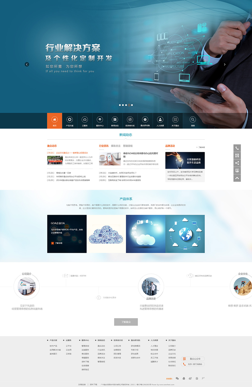 廣州市盈眾信息技術(shù)有限公司成立于2009年,是廣州全島互聯(lián)網(wǎng)科技股份有限公司(股票代碼:430744)旗下專注于信息化管理領(lǐng)域的高新科技企業(yè),盈眾信息從企業(yè)協(xié)同辦公領(lǐng)域的佼佼者到智慧管理及數(shù)字教育創(chuàng)新者,致力于為大中型企業(yè)及政府企業(yè)提供企業(yè)管理平臺(tái)、應(yīng)用支撐系統(tǒng)、行業(yè)解決方案及人才外派服務(wù),以的技術(shù)及優(yōu)質(zhì)服務(wù)協(xié)助客戶創(chuàng)造更大價(jià)值。
