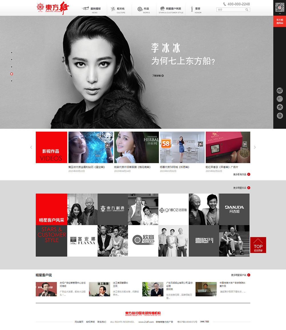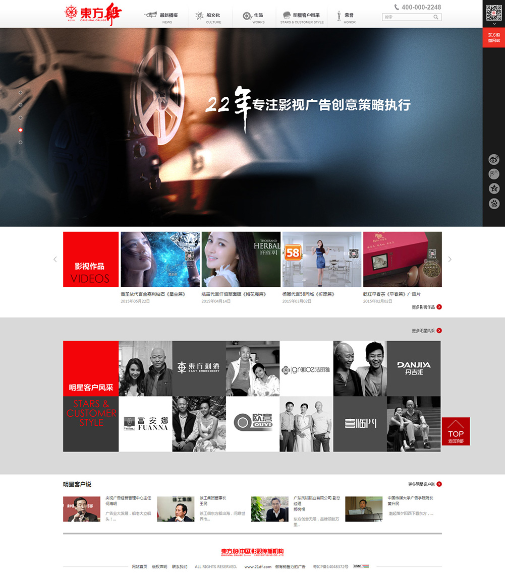 東方船廣告成立于1992年,致力于成為中國企業(yè)的戰(zhàn)略伙伴,為企業(yè)提供品牌咨詢、營銷策劃、市場推廣、影視廣告創(chuàng)意制作等服務。同時,在公司自身的品牌構建和企業(yè)文化的塑造上,東方船亦在業(yè)界樹立了良好典范。